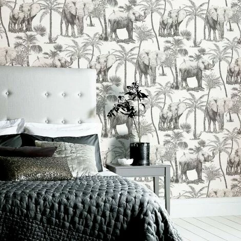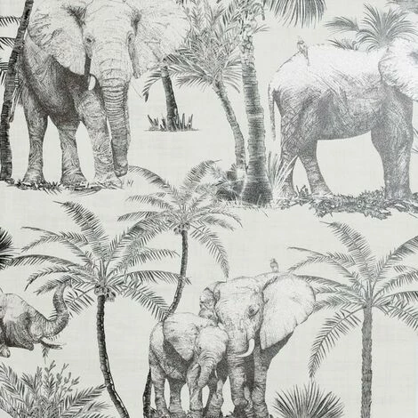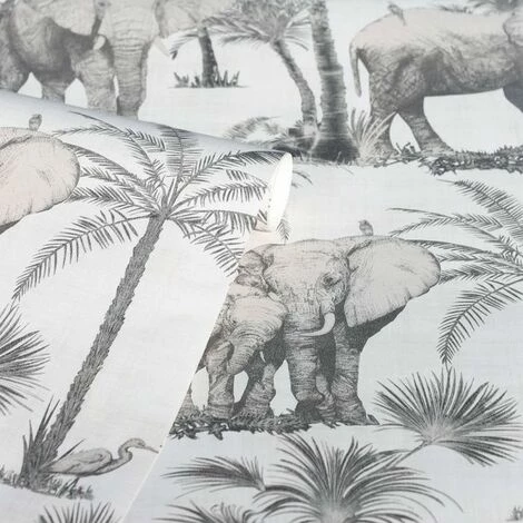 Material: Paper. Design: Elephant, Palm Tree. Design Repeat: 64cm. Easy Application, Easy To Remove, Peelable, Repositionable, Safe for Walls, Self Adhesive. Finish: Linen, Matte.