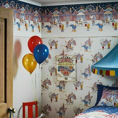 Features a fun circus design, flat finish, Spongeable, Good lightfastness, Wet removable, Roll size: 10m x 0.53m, Coverage per roll: 5.32sqm approx, All rolls ordered together will be the same batch number,