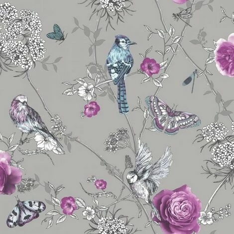 Design: Birds, Butterflies, Flowers, Leaves, Tree Branch. Design Repeat: 21in. Easy Application, Offset Pattern Match, Paste the Paper. Finish: Glitter, Metallic, Sheen.