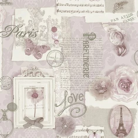 This flat wallpaper is brought to life in a soft, pink colour scheme which has been embellished with the Eiffel Tower, butterflies, musical notes and calligraphy writing. Metallic accents add a glamorous finish to this stunning wallpaper.