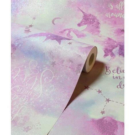 The Arthouse Glitter Unicorn Blush/ Multi Wallpaper is an easy way to add a dash of colour to your walls. This striking wallpaper is sure to make a welcome addition to your home. Features inspiring quotes and ethereal landscapes with unicorn silhouettes. Mixing different shades of pinks and whites, this dreamy wallpaper is finished with all over soft glitter for a truly mesmerising wallpaper.
