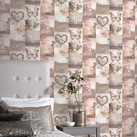 Product Details: This Love Paris wallpapers feminine design has a romantic collage theme that includes roses, crystals, hearts and the Eiffel Tower in soft tones of blush pink, lilac and gold, with silver gel glitter highlights to catch and reflect the light. Product Specifications: Pattern Repeat: 26.5cm Pattern Match: Offset Match Wallpaper Type: Paper Wallpaper Finish: Flat Durability: Spongeable Roll Length: 10m Roll Width: 53cm Roll Coverage is 5.3 Square Metres Application: Paste the Paper Product Code: 691107