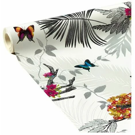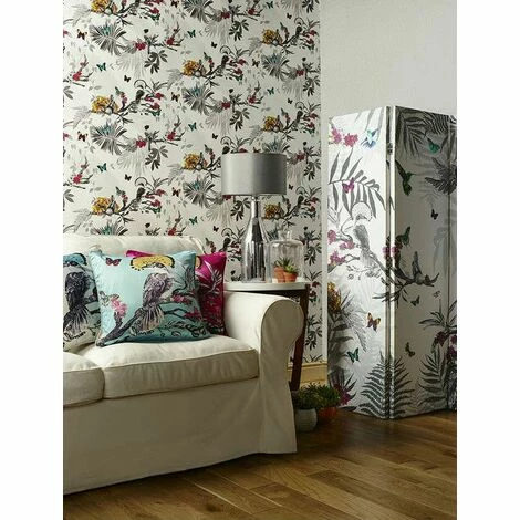 The Arthouse Mystical Forest White Wallpaper is an easy way to add a dash of colour to your walls. This striking wallpaper is sure to make a welcome addition to your home. Features a striking tropical forest design with pretty birds sat on illustrative branches with photographic and exotic flowers. With tropical leaf silhouettes falling softly in the background, this design is brought to life with shimmering accents of glitter for a truly mesmerising wallpaper.