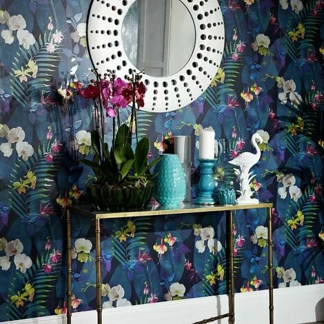 The Arthouse Pindorama Navy Wallpaper is an easy way to add a dash of colour to your walls. This striking wallpaper is sure to make a welcome addition to your home. Features an interesting interlocking leaf and floral design with high gloss highlights that add a shiny and beautiful texture to the wallcovering. Delicate colourful flowers contrast with a background shadow print for an impactful effect on your walls for a truly mesmerising wallpaper.
