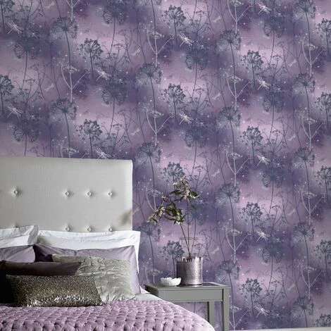 Damselfly wallpaper designed by Arthouse, purple colourway.