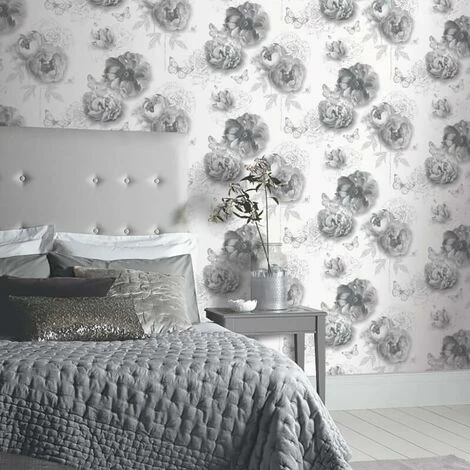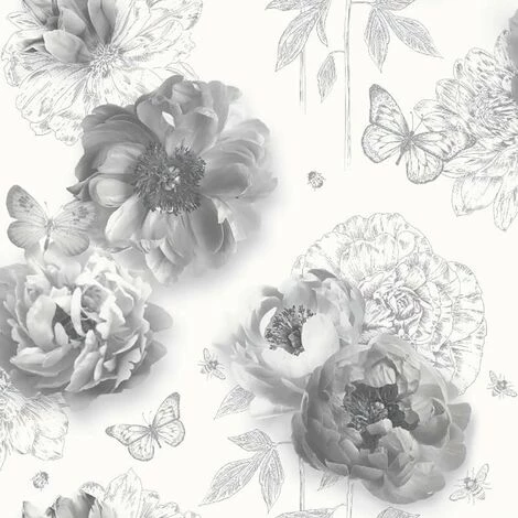 This beautiful Flower Garden wallpaper from Arthouse is sure way to add a touch of style and class to your walls. Features a lovely floral pattern and prints of butterflies in silver and grey tones with glitter detail throughout, set on a luxury vinyl for a truly mesmerising wallpaper.