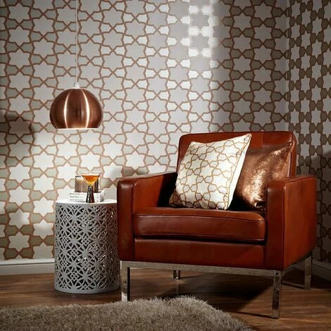 The Arthouse Rio Geometric Copper Glitter Wallpaper is an easy way to add a dash of colour to your walls. This striking wallpaper is sure to make a welcome addition to your home. Features a beautiful interlocking star lattice design. The rich, copper tones add warmth whilst the geometric pattern adds a sense of style, enhanced with glitter accents for a subtle sparkle effect and a truly mesmerising wallpaper.