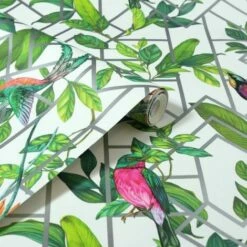 Arthouse Deco Tropical Metallic Silver Navy Green Birds Geo Wallpaper 908003