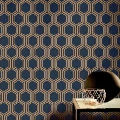 Hexagon Geometric Wallpaper Navy Blue Gold Metallic Textured Arthouse Luxe